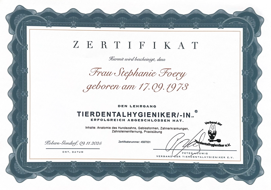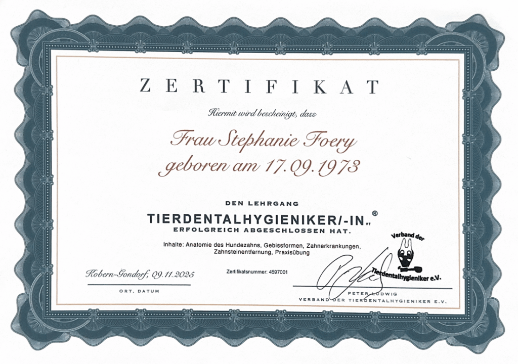 Juhuuu! Ich freue mich riesig, euch mitzuteilen, dass ich meine Fortbildung zur Tier-Dental-Hygienikerin erfolgreich abgeschlossen habe. Es war ein spannender und lehrreicher Tag.